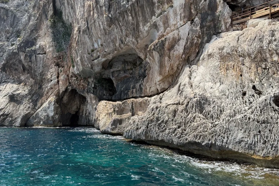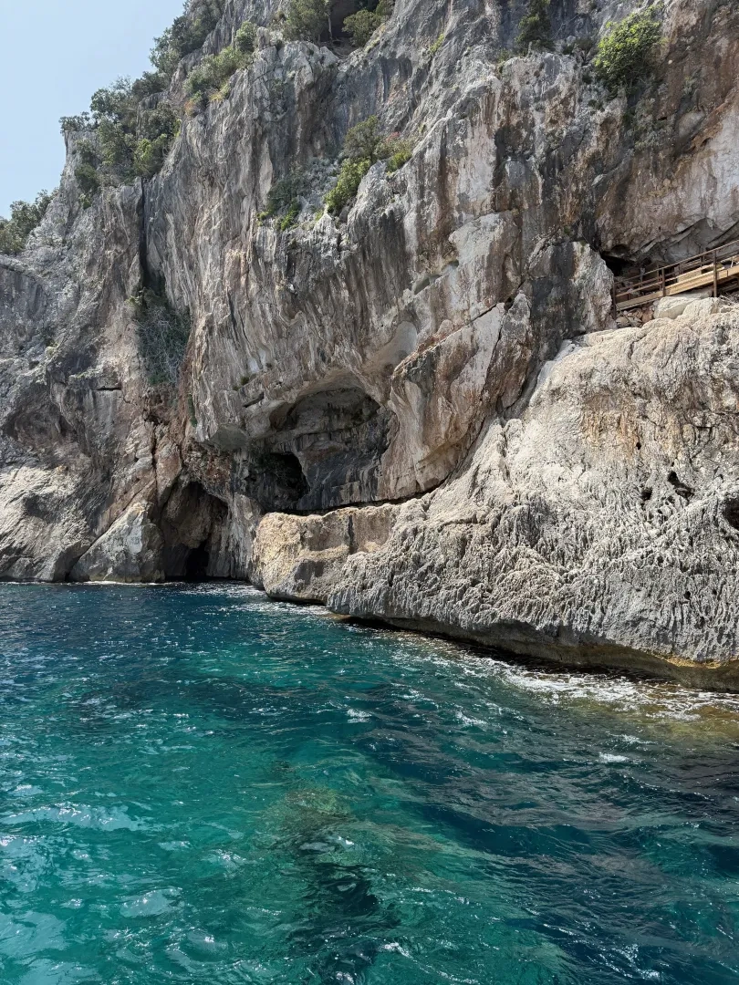 Die Fahrt führte uns entlang der Ostküste Sardiniens, beginnend am Hafen von Santa Maria Navarrese Richtung Norden bis etwa Cala Mariolu, also entlang des Bergmassivs Supramonte durch den Golf von Orosei. Blaues Wasser so klar, dass man bis auf den Grund schauen kann bei dreißig Metern Wassertiefe, strahlend weiße Strände eingehüllt von Felsen der beeindruckenden Steilküste. Zwischendurch hielten wir an mehreren Stränden und konnten in die Grotta del Fico, eine Höhle, die nur vom Wasser aus zugänglich ist besichtigen.